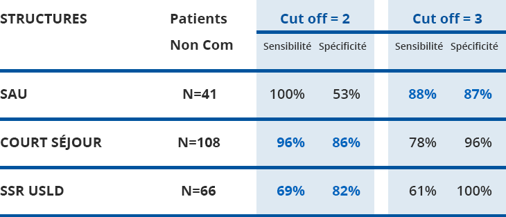 - – La sensibilité (= capacité de détecter la présence d’une douleur) et la spécificité (certitude d’une douleur) de l’échelle ont été testées dans différents services de soins chez les patients avec ou sans trouble de la communication verbale et selon 2 valeurs de score seuil (Cut-off).